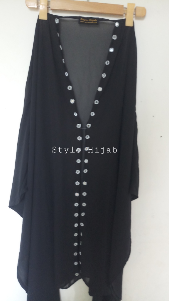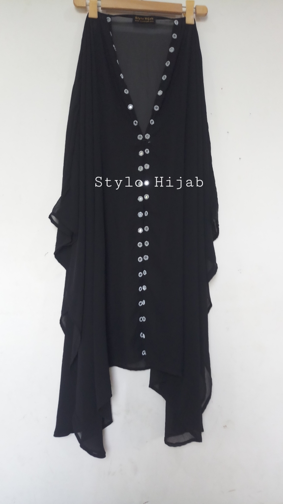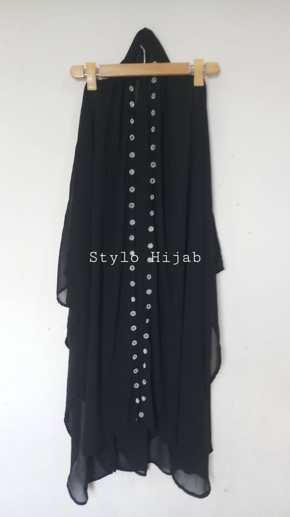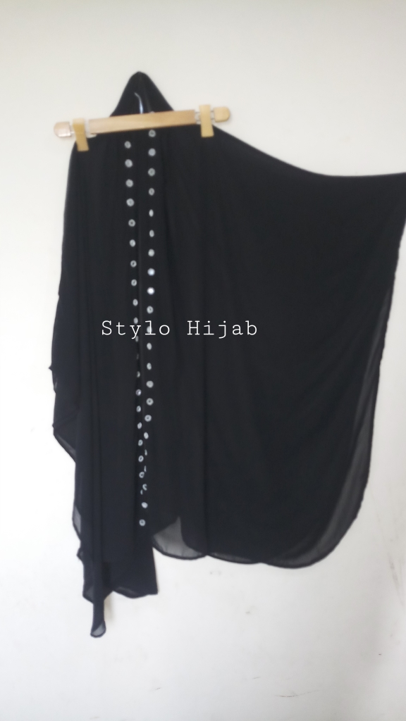 Black Mirror Wink Upper is specially designed for college, university & office going girls & women. It can be wear in all seasons specially spring & summer. Its material is chiffon with silver mirror attached on front side in two lines. It can be wear on all dresses, it can also be wear on Abayas.