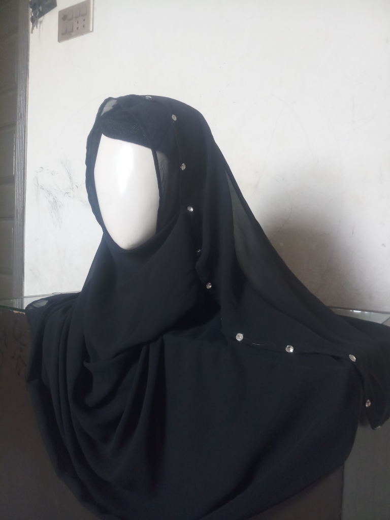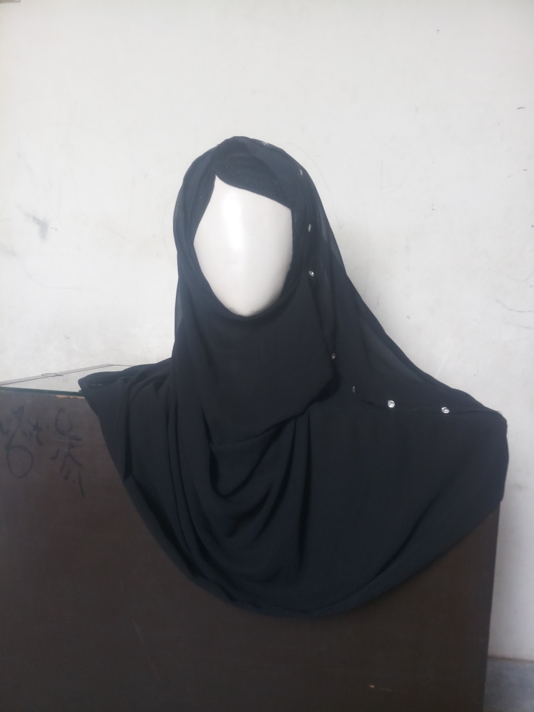 Black Diamondize Double Loop Pinless Hijab is very easy to wear without pins & can be quickly fixed. Its material is Korean chiffon & its colour is black. it has two holes with fancy diamonds on its front side. It is very comfortable & easy to wear specially for students & working women