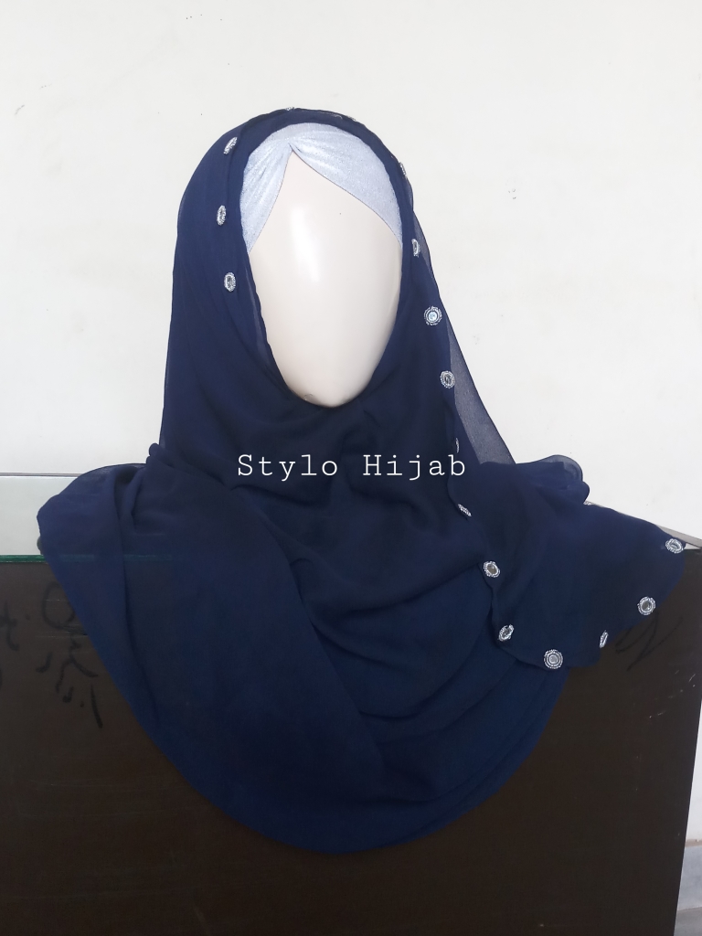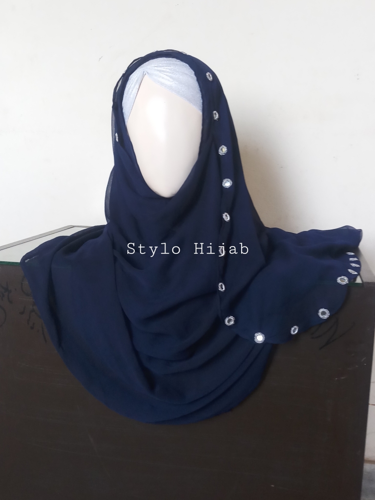 Navy Blue Mirror Pinless Hijab is very easy to wear without pins & can be quickly fixed. Its material is crinkle chiffon & its colour is Navy Blue. it has two holes with fancy mirror on its front side. It is very comfortable & easy to wear specially for students & working women