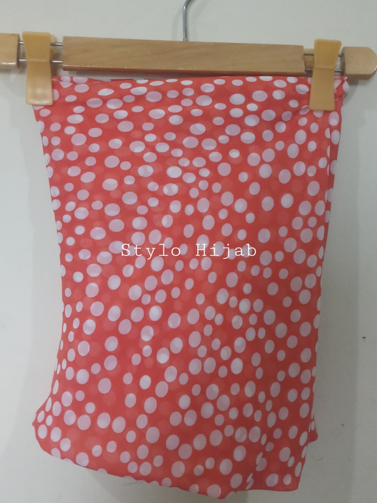 Square Hijab has very unique style & very easy to wear & can be quickly fixed. Its fabric is very soft & its material is Printed Chiffon. Its colour is orange with white circles. It is very comfortable & easy to wear specially for students & working women