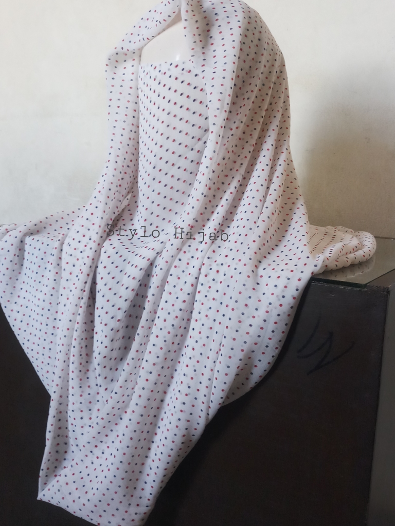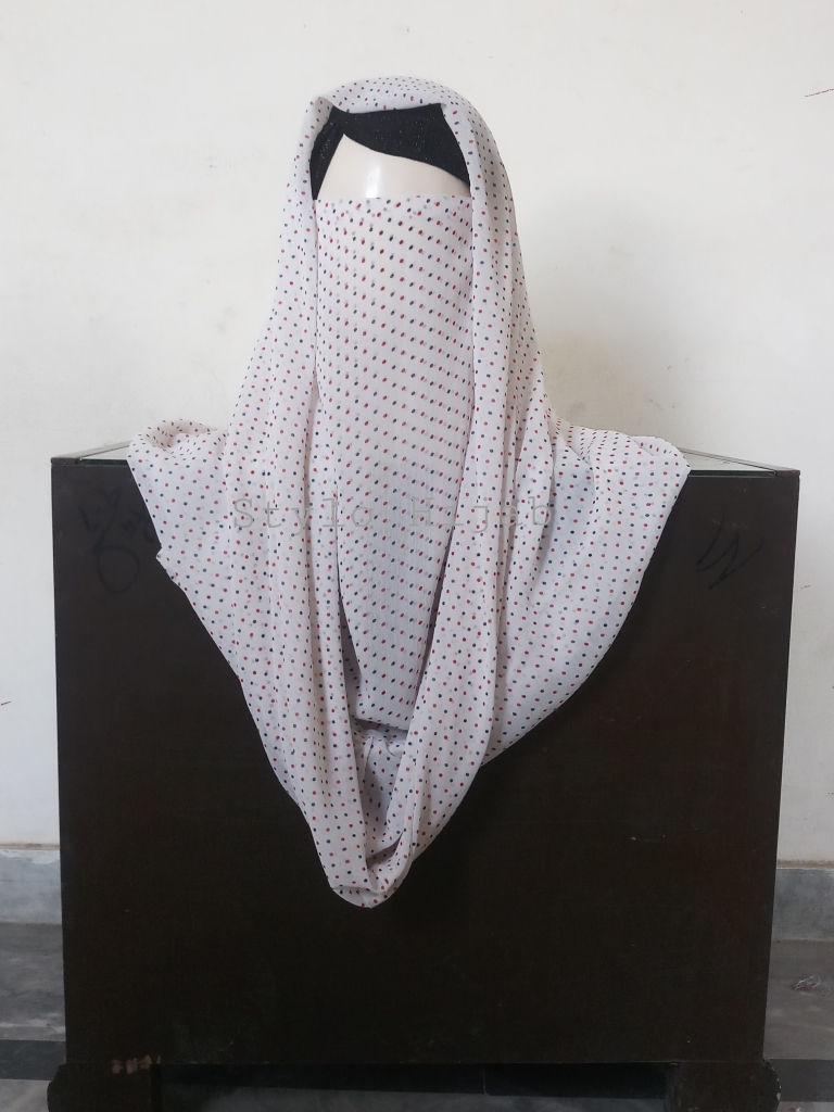 Printed white Misri Hijab is very unique style & very easy to wear & can be quickly fixed. Its fabric is very soft & its material is imported Chiffon. Its colour is Printed white. It is very comfortable & easy to wear specially for students & working women